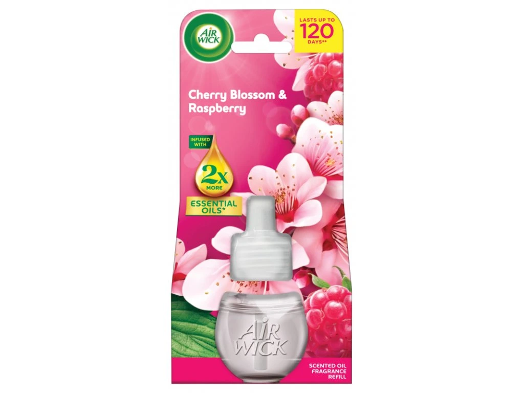 Air Wick tekutá náplň do elektrického osviežovača Essential Oils prevonia váš domov príjemnou vôňou čerešňového kvetu a malín. Preneste sa do pokojných záhrad a nechajte sa zahaliť nádhernou vôňou čerstvo rozkvitnutých kvetov. Prevoňajte svoj domov vôňami inšpirovanými prírodou a vytvorte si hrejivú a príjemnú atmosféru. Novo sú všetky balenia Essential Oils od značky Air Wick v ekologickom papierovom balení bez plastu.