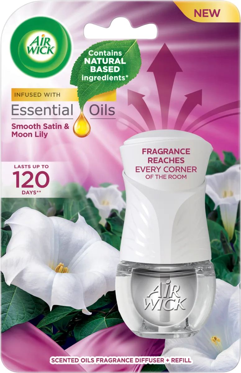 Nový elektrický osviežovač vzduchu - strojček a náplň Air Wick Essential Oils – jemný satén a mesačná ľalia zaistí, že váš domov vždy vonia sviežo a krásne. Zloženie vonného oleja obsahuje zložky na prírodnej báze a je obohatené o prírodné esenciálne oleje, ktoré boli vytvorené tak, aby vám priniesli autentický zážitok z vône. Vôňa Smooth Satin & Moon Lily ponúka bohatú kompozíciu večerných kvetov a šťavnatého ovocia s jemnými tónmi pižma. Navyše vďaka novej technológii sa vôňa dostane do každého kúta miestnosti a vytvorí príjemné prostredie. Elektrický difuzér Air Wick s výrazne zníženou spotrebou elektrickej energie ponúka príjemnú vôňu, ktorá trvá až 120 dní pri nastavení najnižšej intenzity.