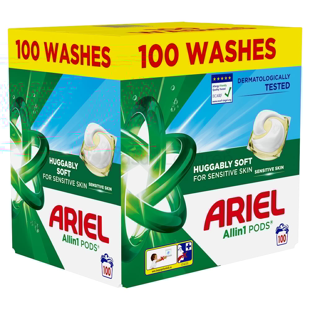 Úvod » Drogéria » Pracie prášky, gély » Pracie gély, kapsule » Ariel kapsule na pranie Sensitive Skin 100ks