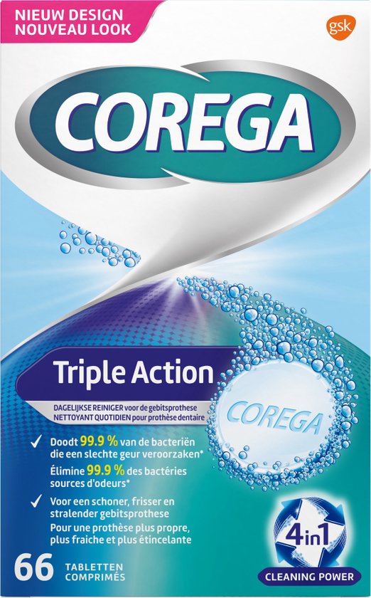 Antibakteriálne čistiace tablety COREGA v balení po 66 ks sa starajú o umelé zubné náhrady, čistí ich bez poškriabania a účinne z nich odstraňujú sfarbenie, odolné škvrny a povlak. Pôsobí rýchlo behom troch minút a zanechávajú náhrady dokonale čisté a svieže. Vynikajú antibakteriálnymi a dezinfekčnými účinkami a predchádzajú podráždeniu spôsobenému zubným povlakom a tvorbe zubného kameňa.