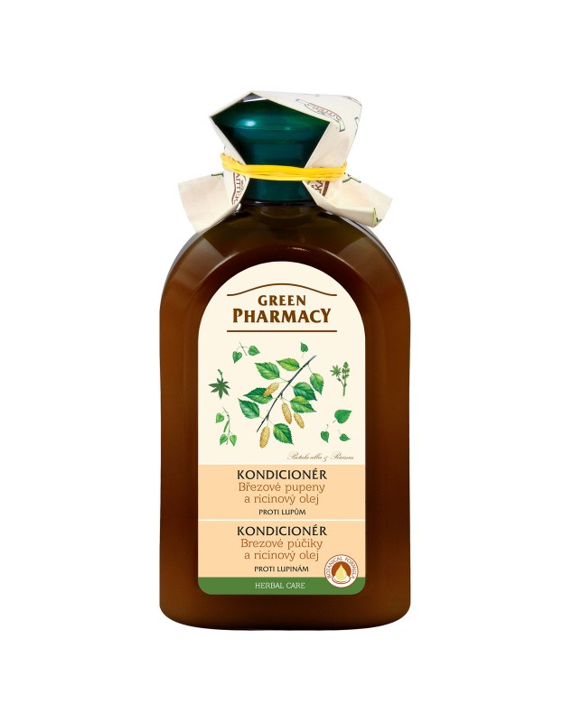 Green Pharmacy kondicionér proti lupinám. Dodáva vlasom lesk a umožňuje ľahké rozčesávanie. Extrakt z púčikov brezy a ricínový olej pôsobia proti suchosti, svrbeniu a podráždeniu pokožky hlavy spôsobenej lupinami.