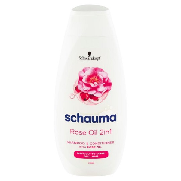 Schauma Silk Comb šampón a kondicionér 2v1 s ružovým olejom pre vlasy bez lesku, ktoré sa ťažko rozčesávajú.